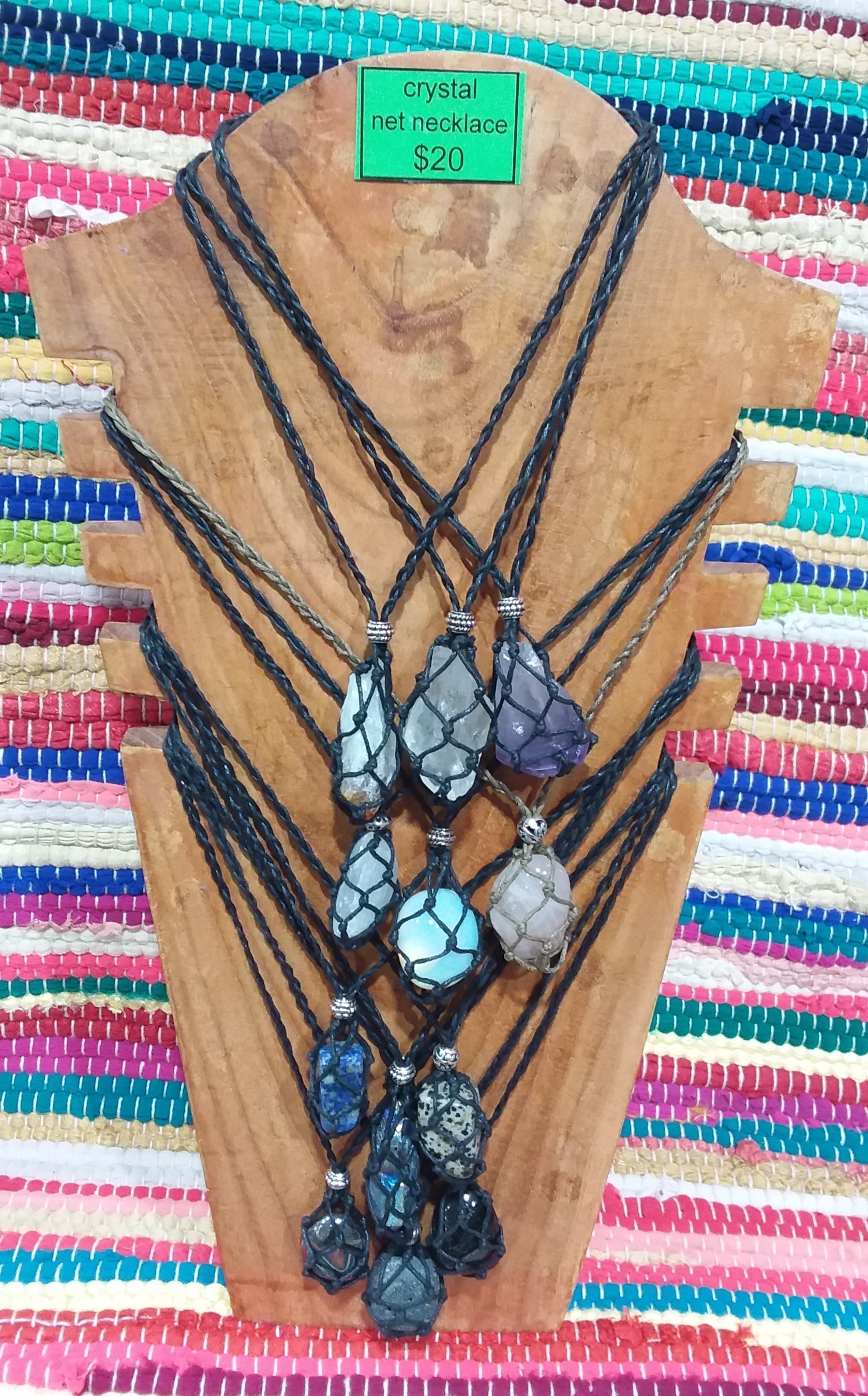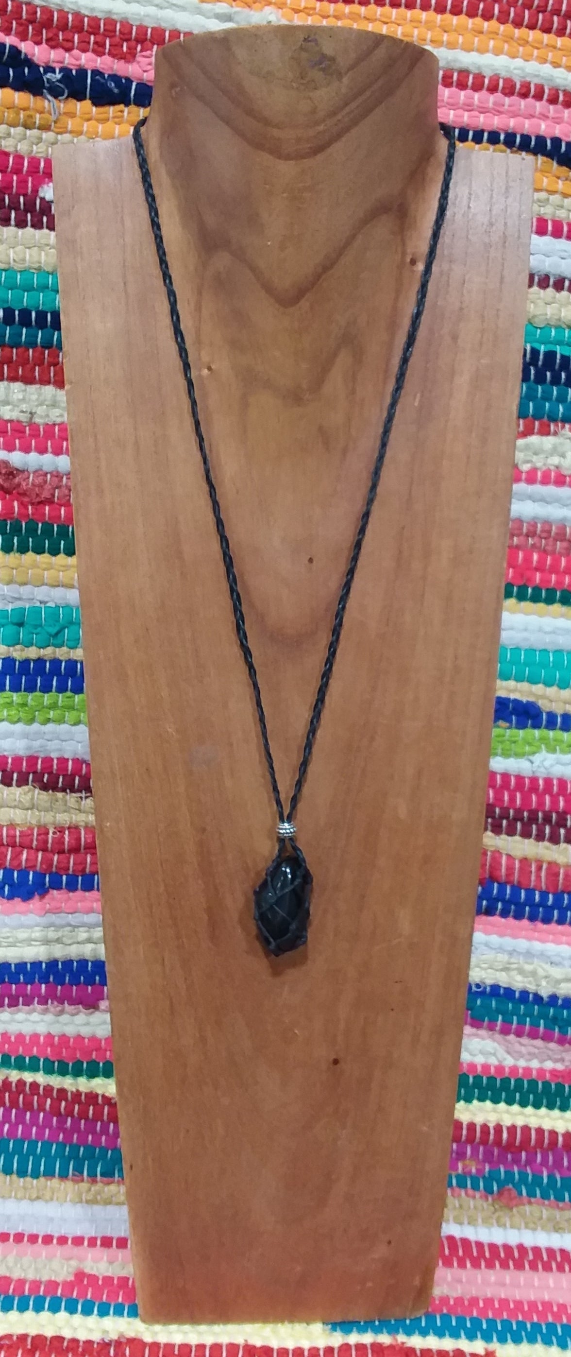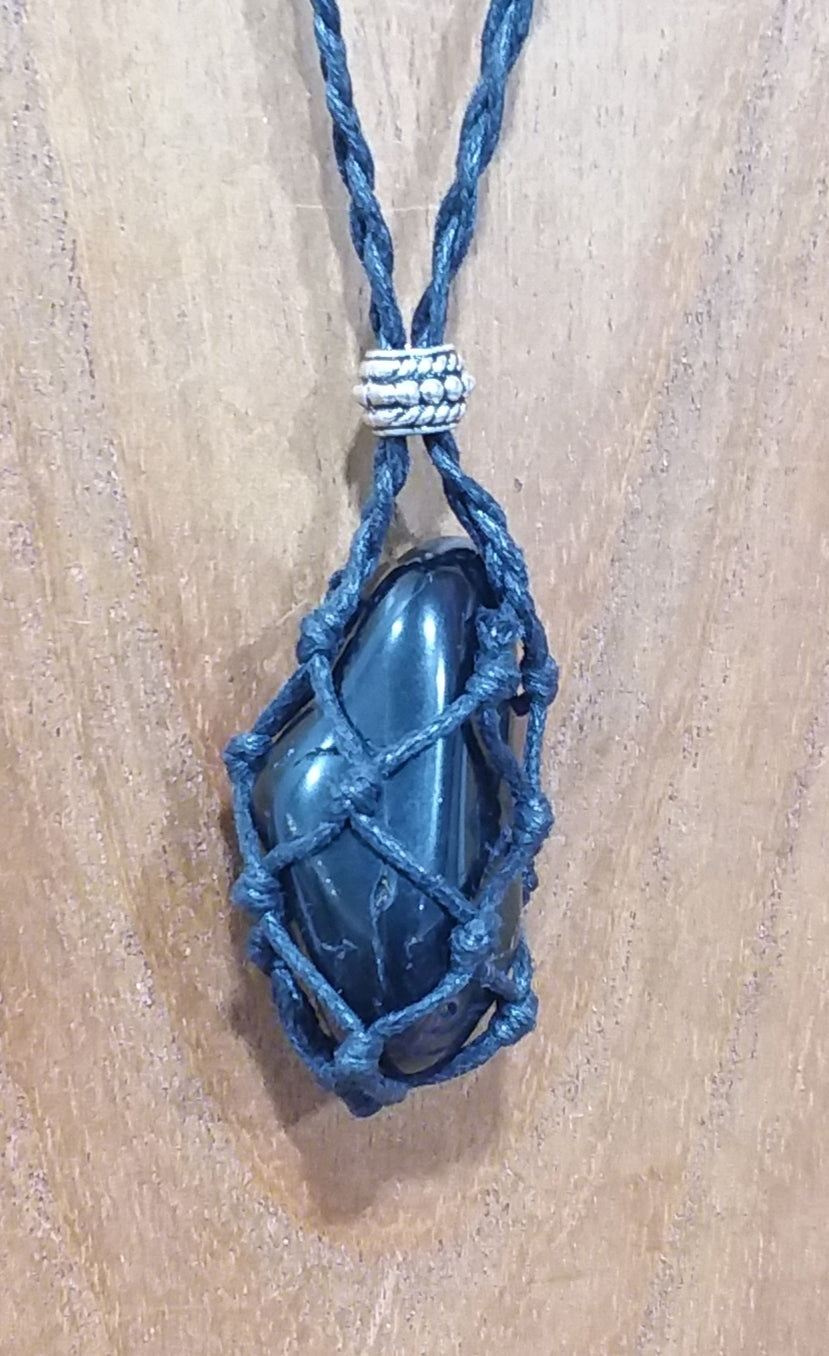 A beautiful piece of tumbled Black Tourmaline inside a waxed cotton knotted net.