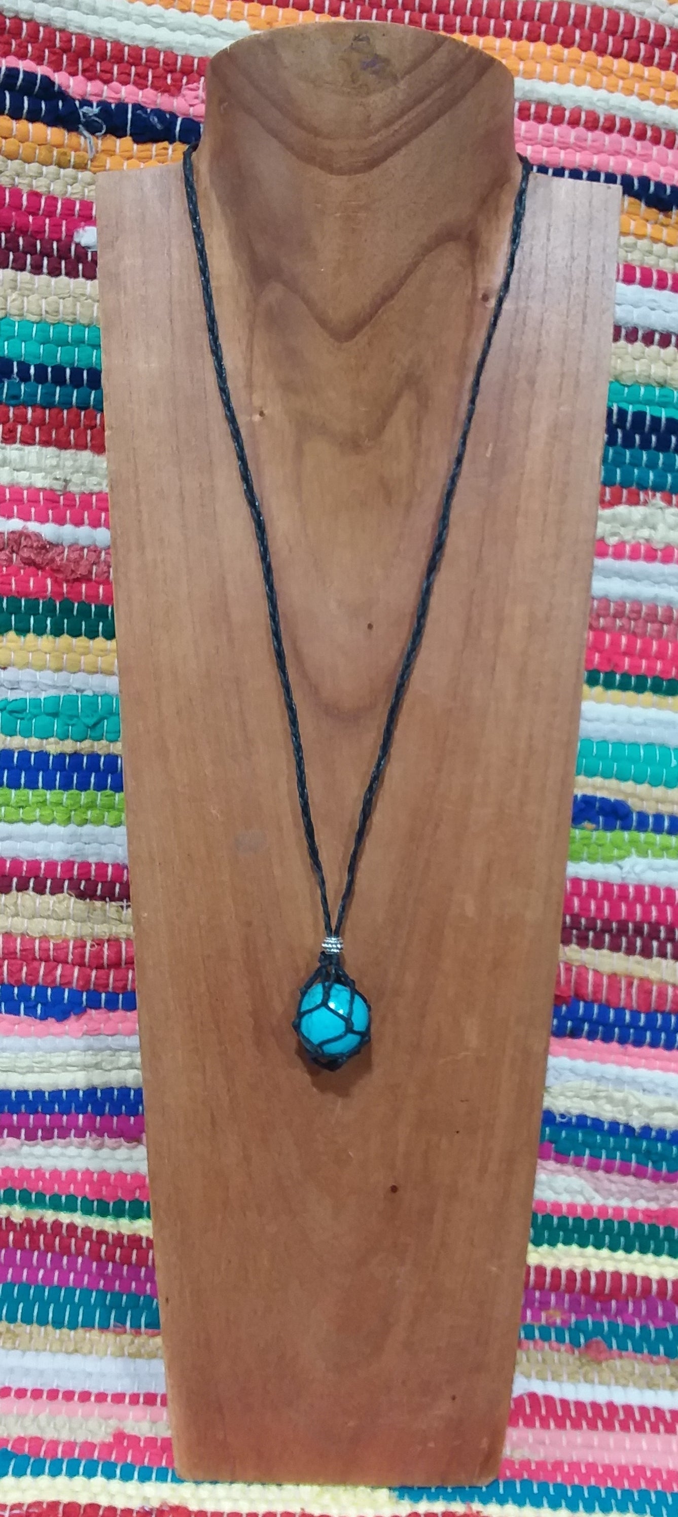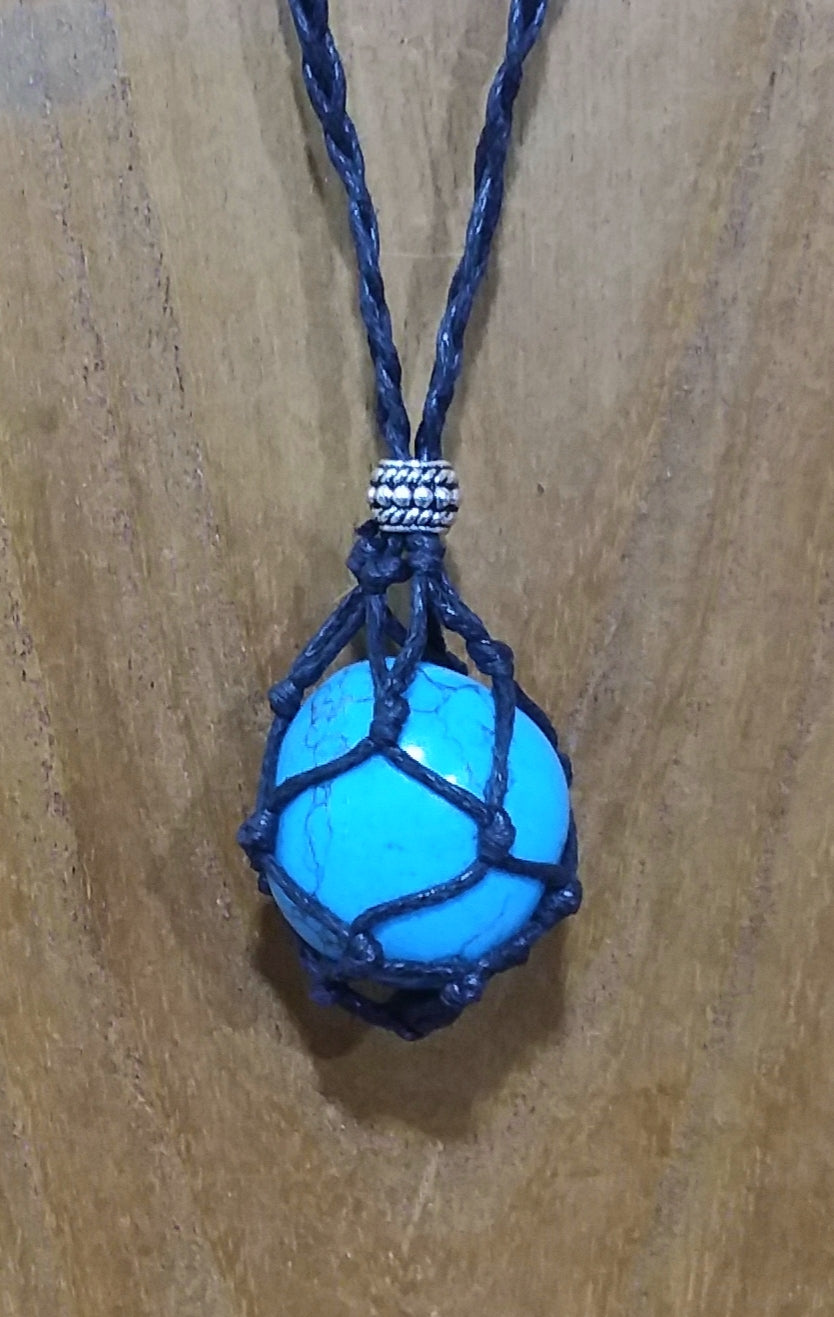A beautiful piece of tumbled Blue Howlite inside a waxed cotton knotted net.