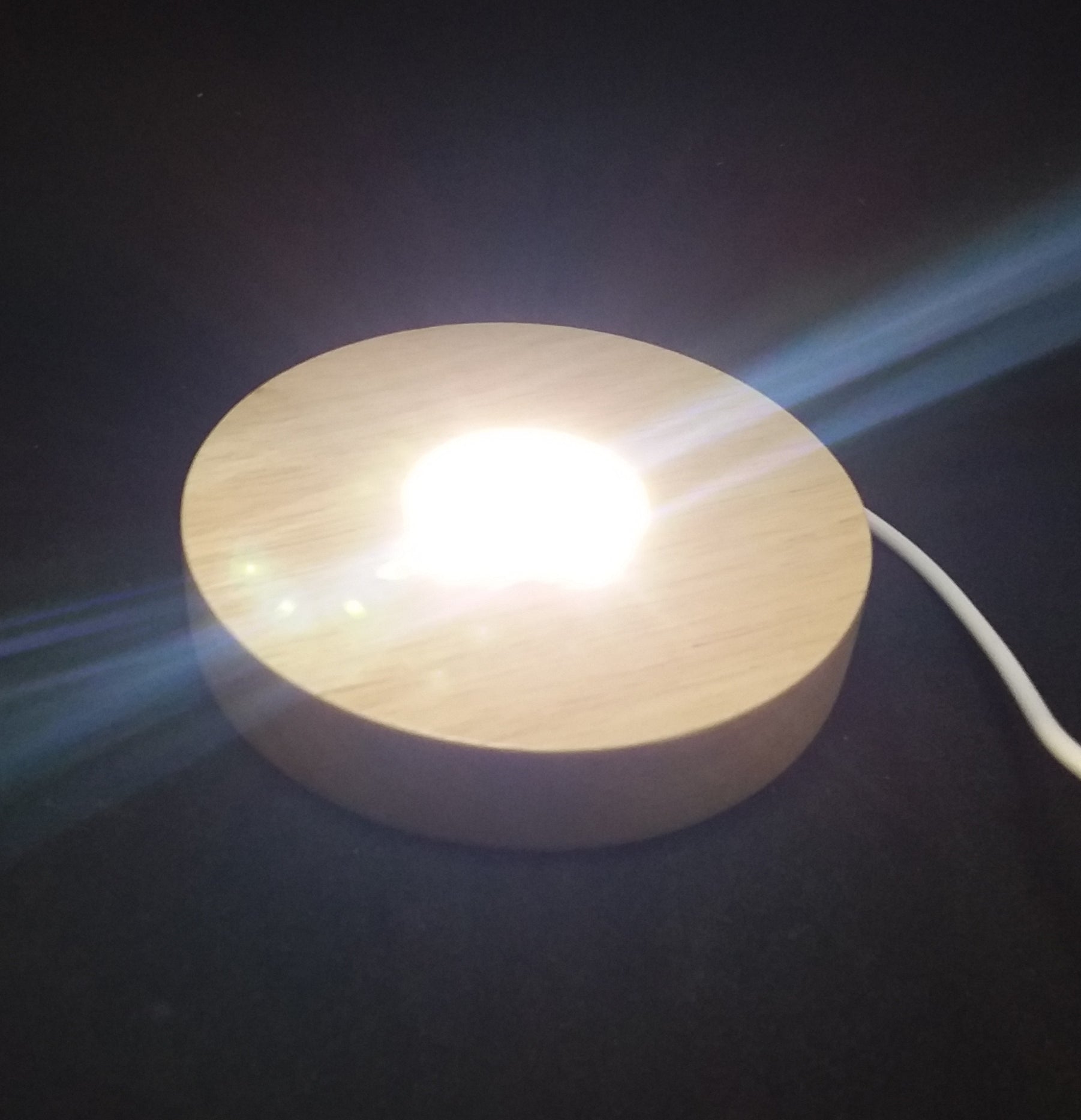 Sits on top of 10cm diameter wood base with bright LED lights.