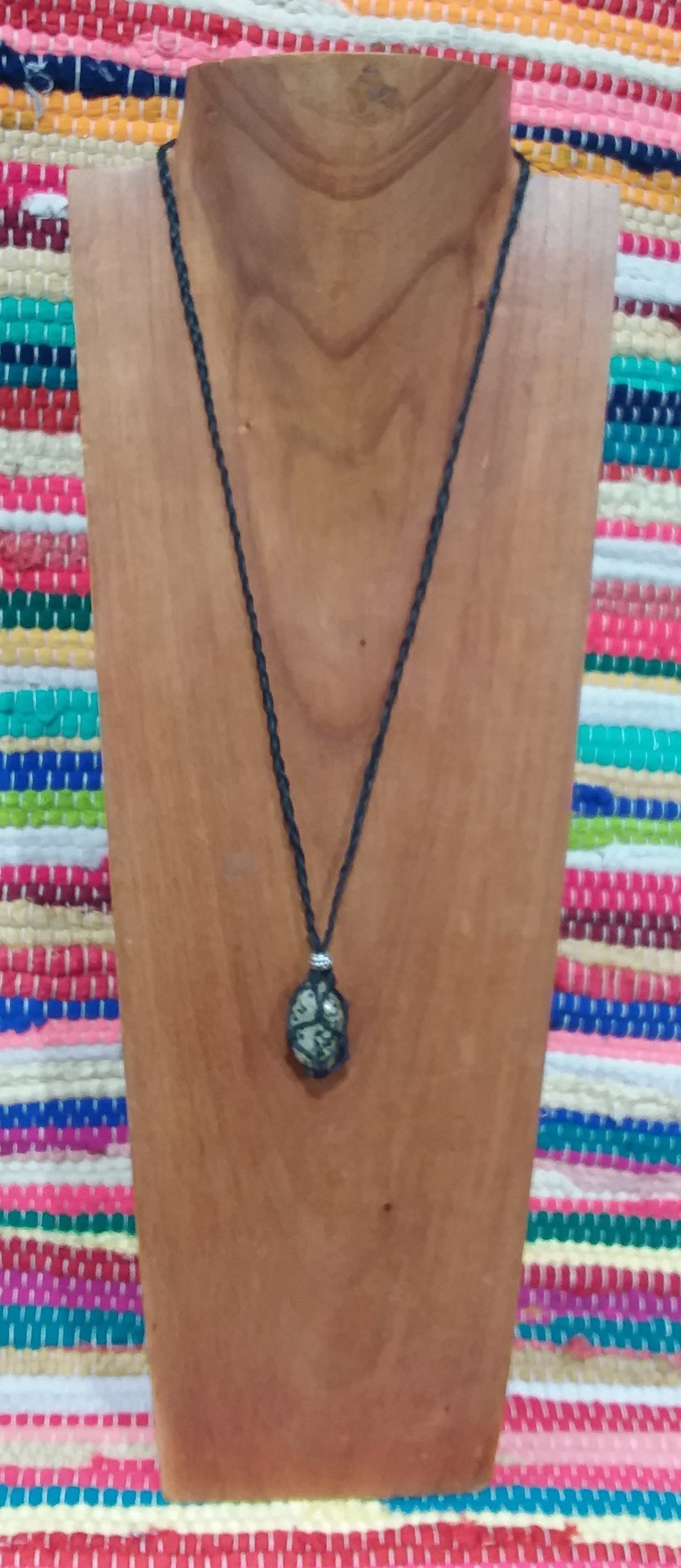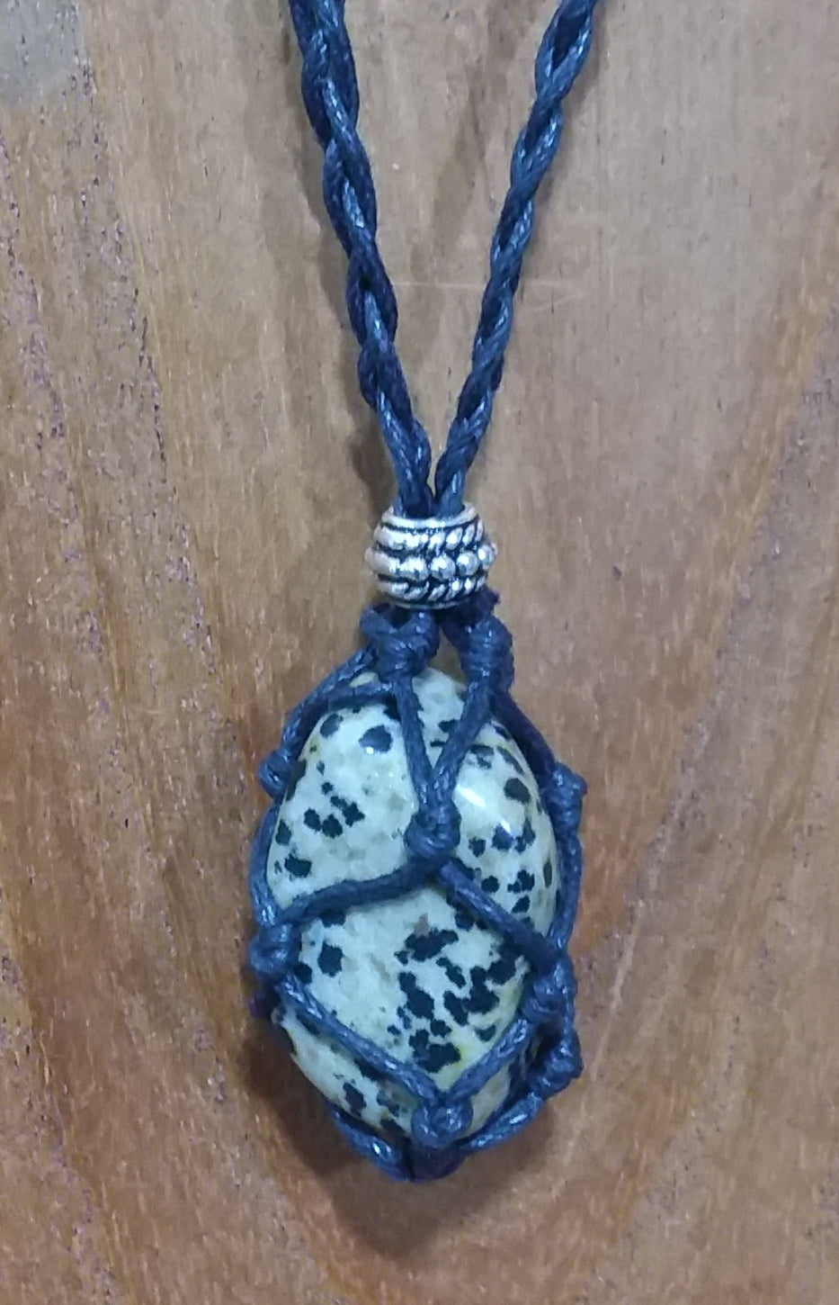 A beautiful piece of tumbled Dalmation Jasper inside a waxed cotton knotted net.