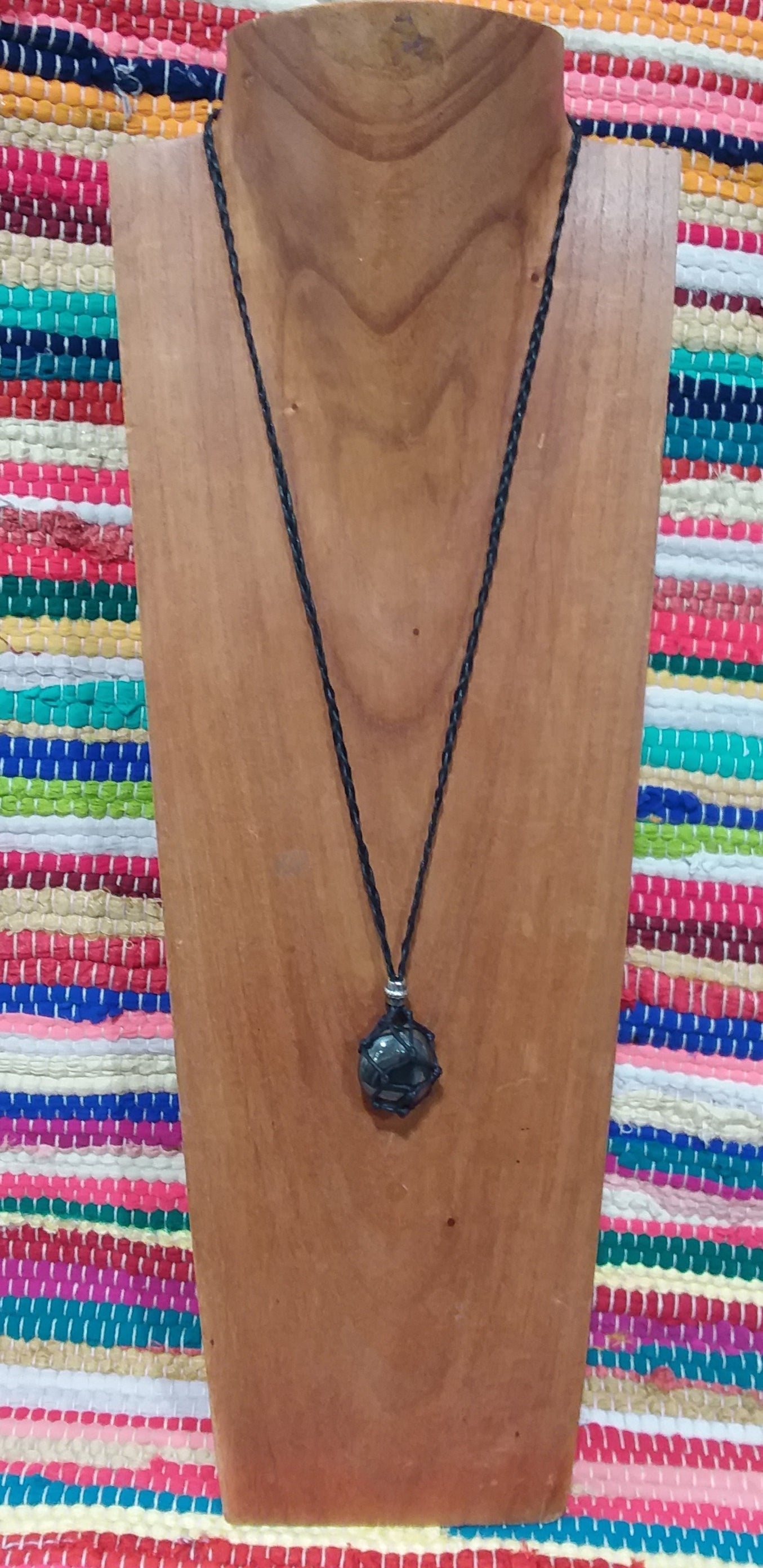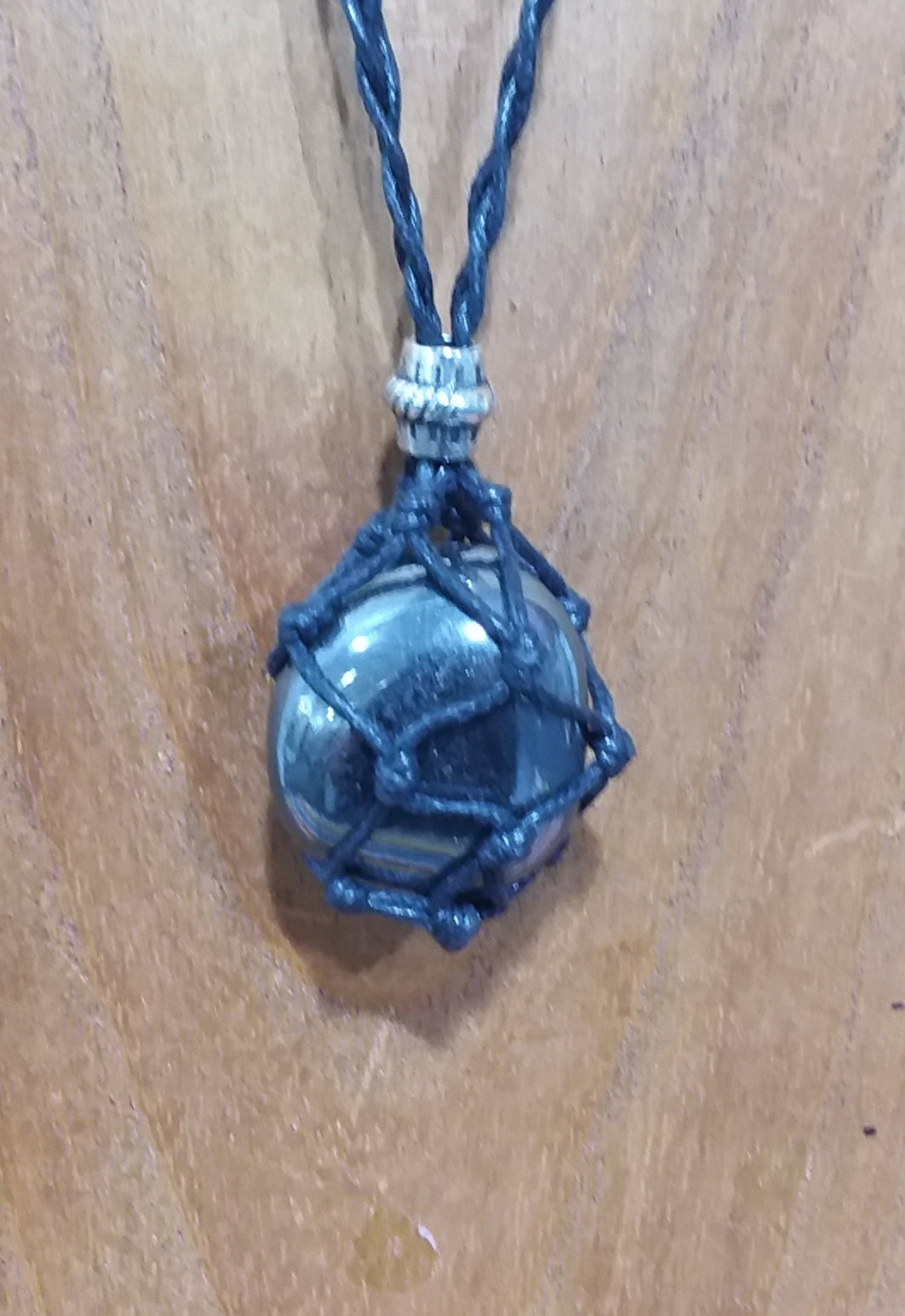A beautiful piece of tumbled Hematite inside a waxed cotton knotted net.