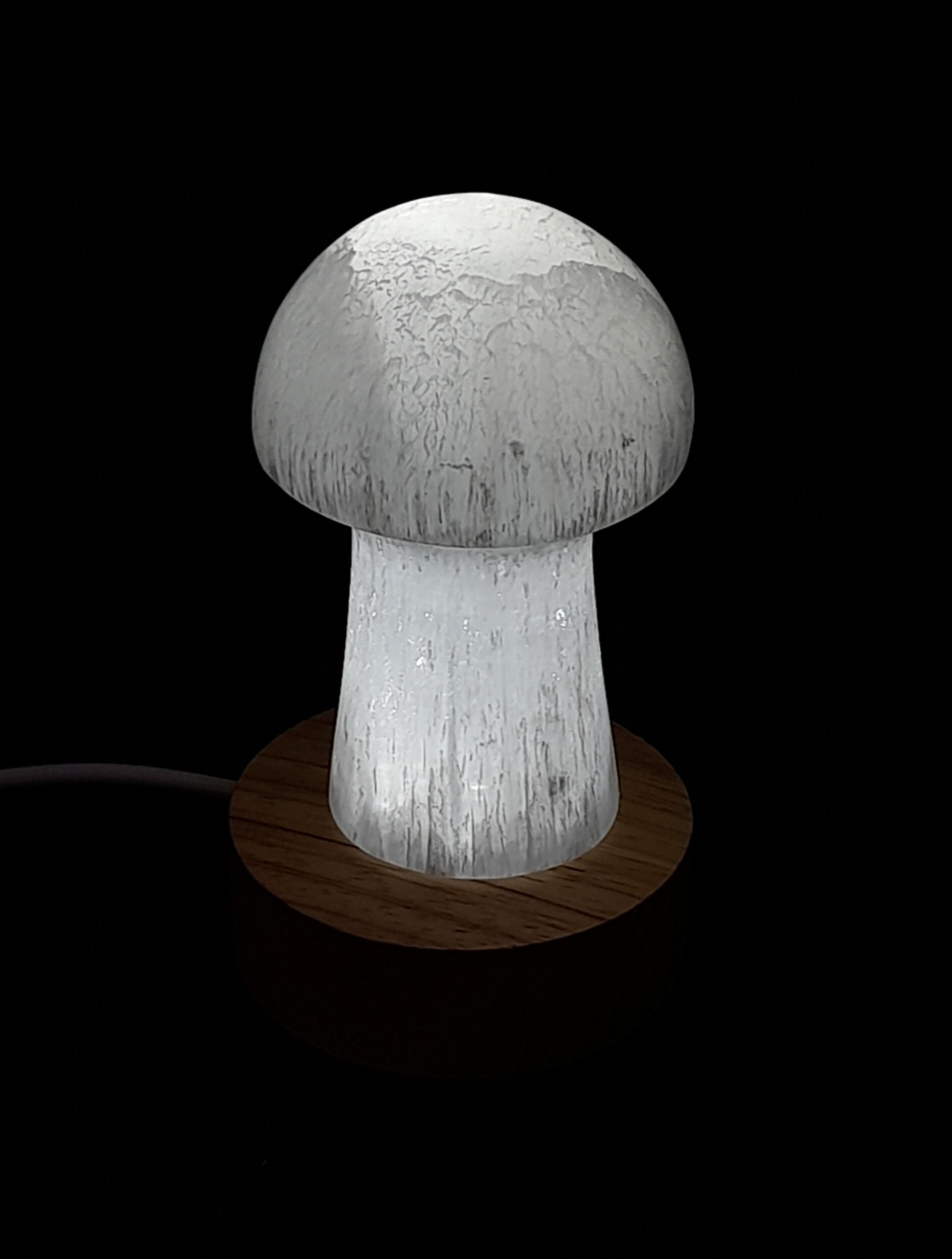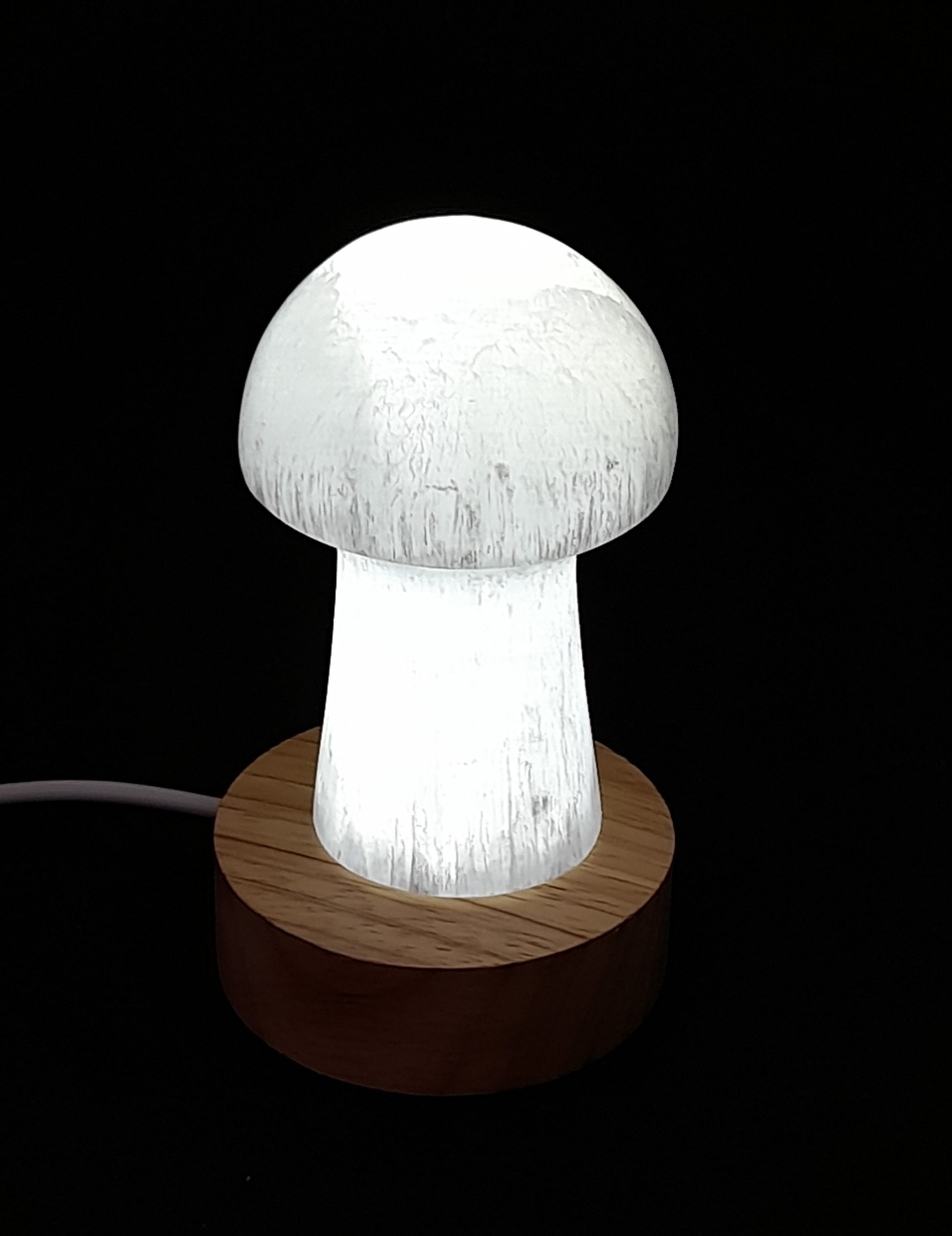 Sits on top of 6cm diameter wood base with bright LED lights.