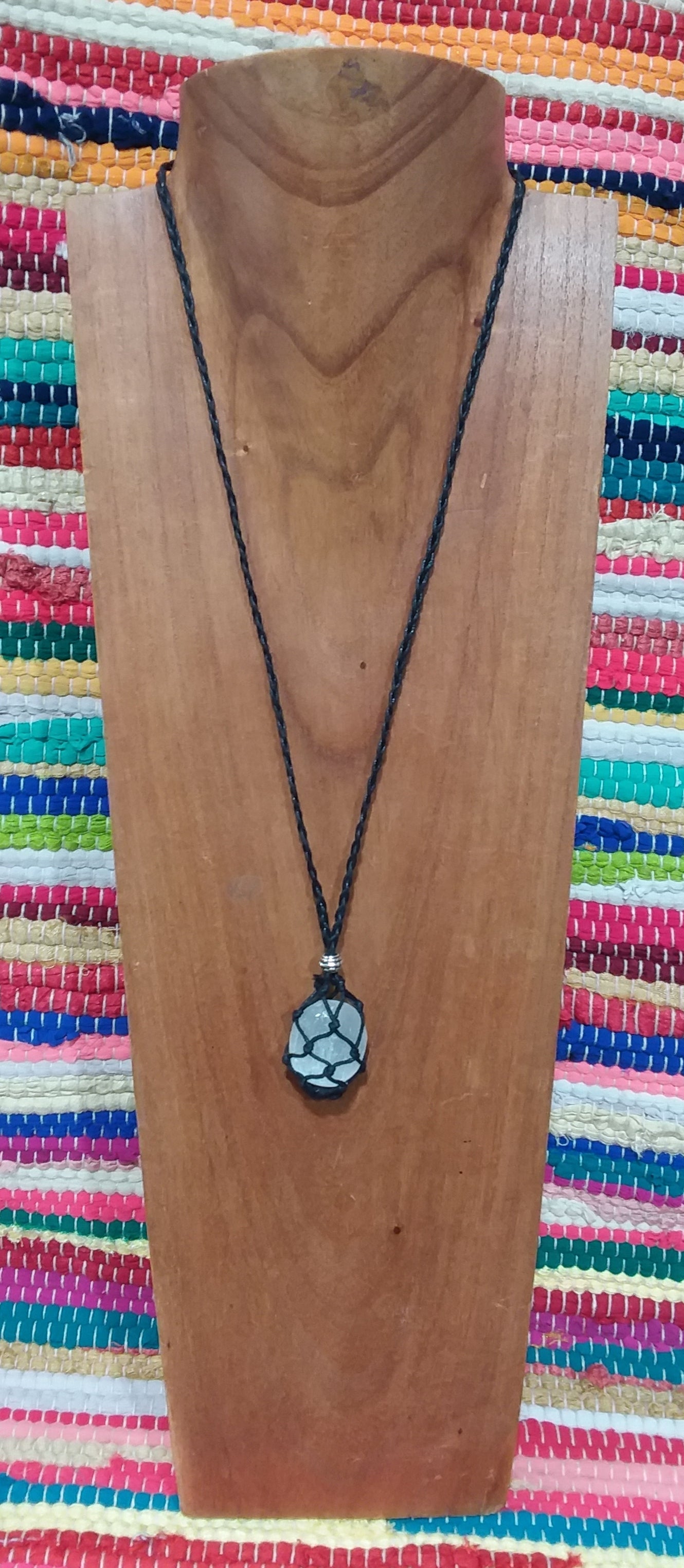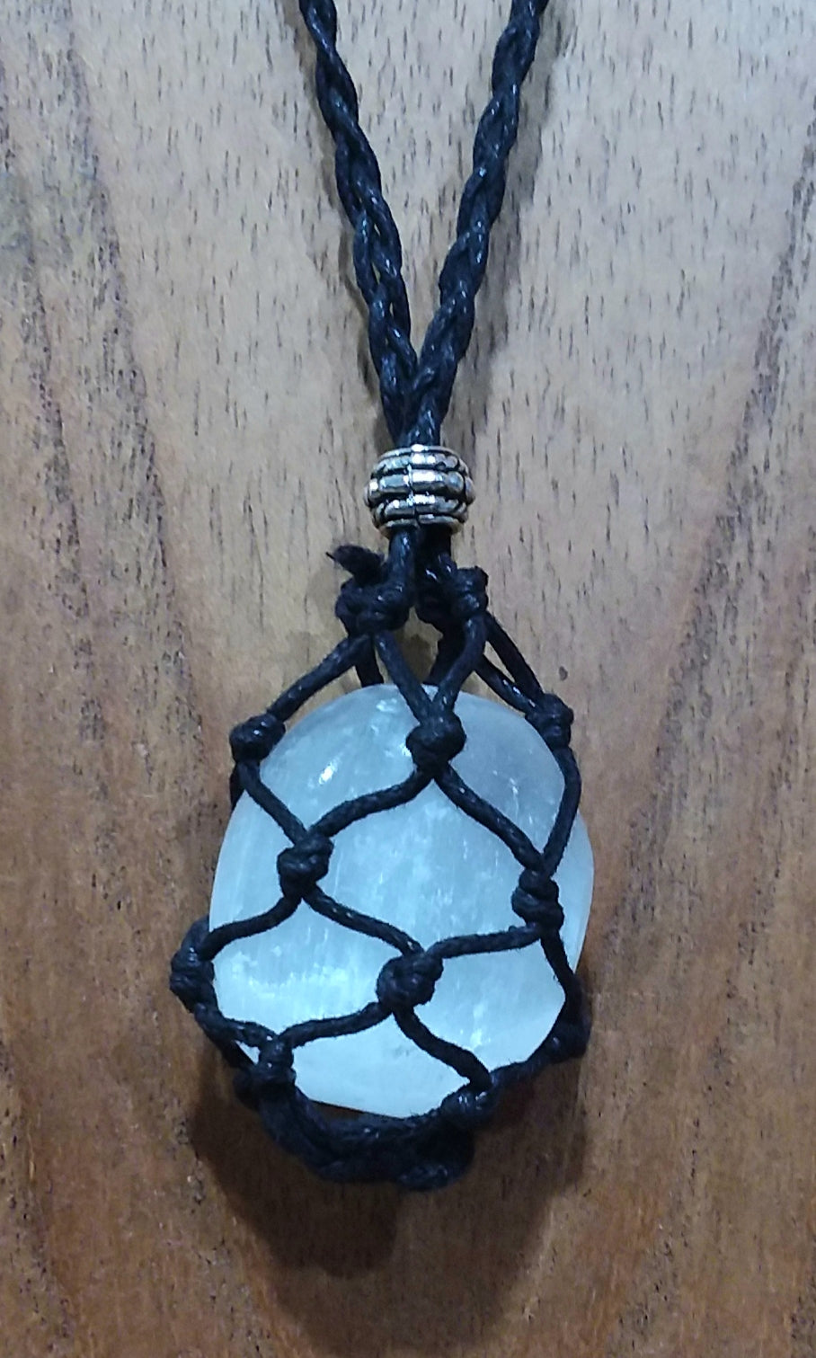 A beautiful piece of tumbled Selenite inside a waxed cotton knotted net.